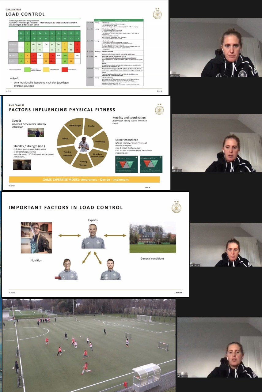 وألقت المحاضرة التي أقيمت "عن بعد" الألمانية بريتا كارلسون مساعدة مدربة المنتخب الألماني، ومنسقة التطوير بالاتحاد الألماني للفئات السنية النسائية، والحاصلة على شهادة المحترفين في تدريب كرة القدم الأوروبية.