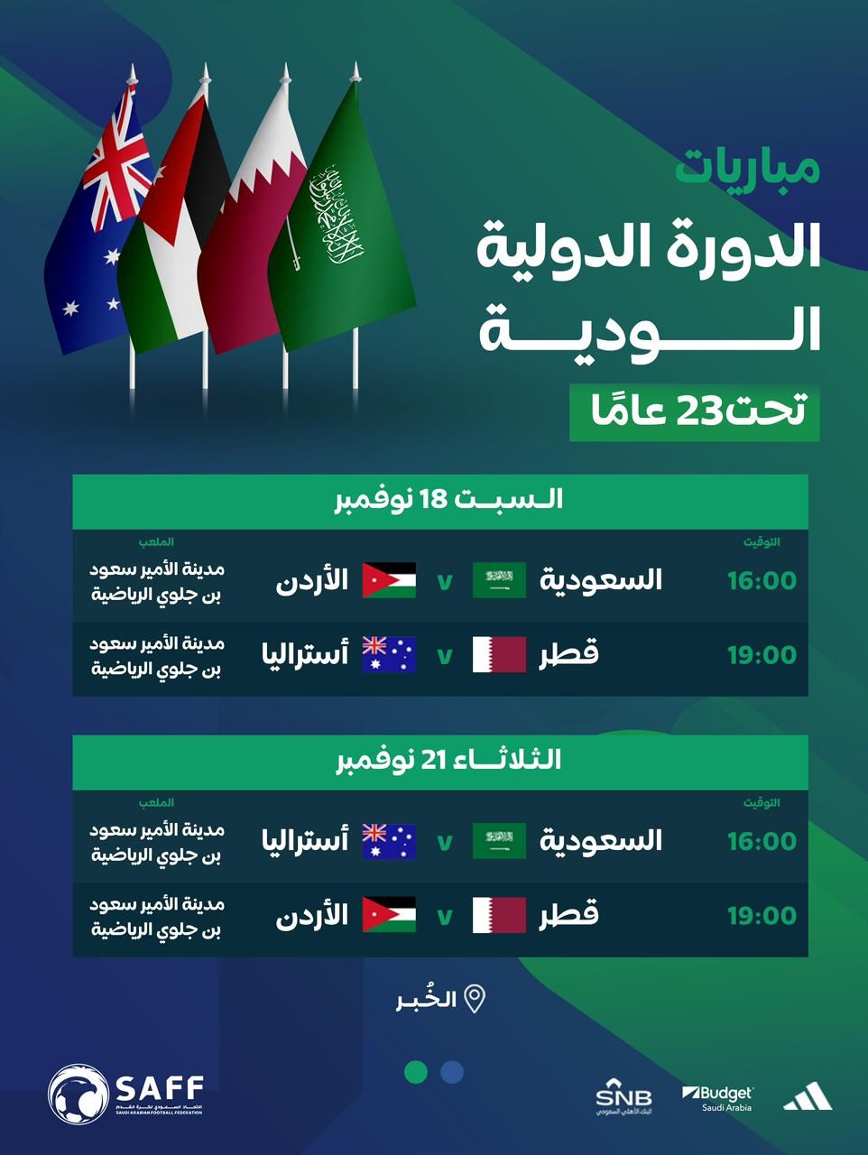 On November 21, two matches will be held, as the under-23 national team will face Australia, while Qatar and Jordan national teams will face each other. as the matches will be held at Prince Saud bin Jalawi Sports City Stadium in Al-Khobar.