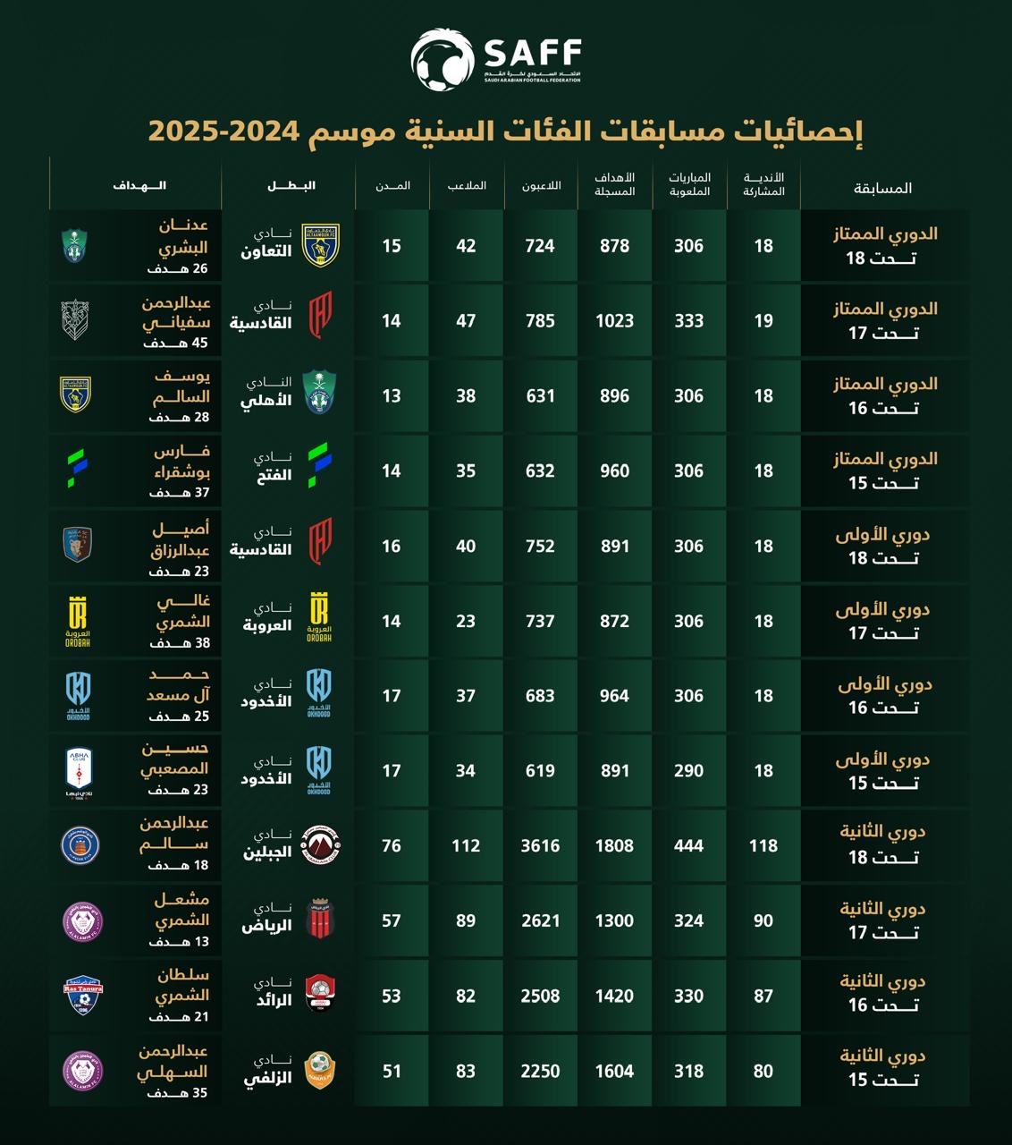 Many figures reflect the extent of the development witnessed in the youth competitions during the 2024-2025 season. Most youth and junior leagues saw the participation of 18 teams, with an average of 306 matches played in each competition, while the number of goals scored in each competition ranged from 878 to 1,023.