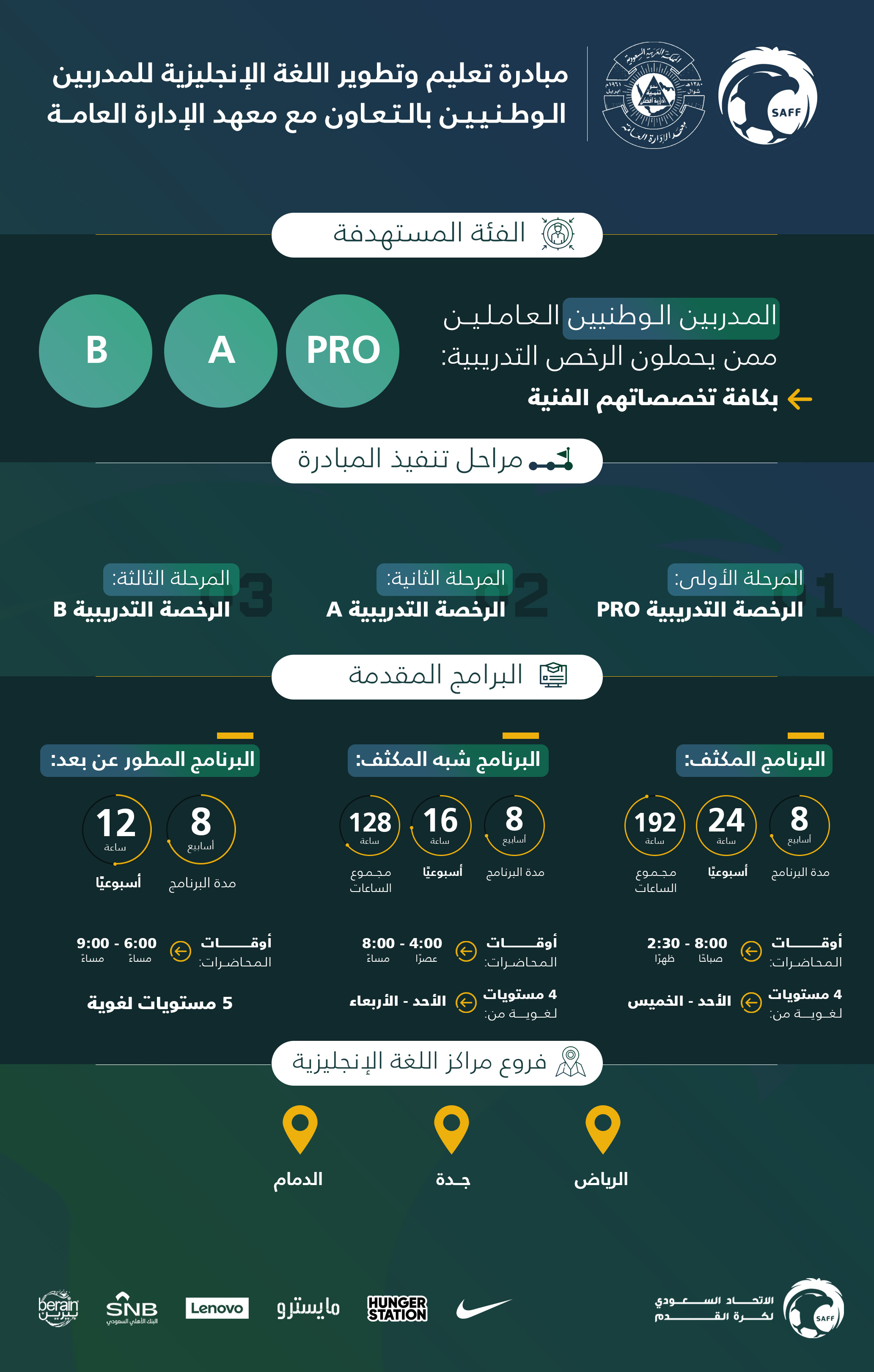 وتستهدف المبادرة رفع مستوى المهارات اللغوية في اللغة الإنجليزية للمدربين الوطنيين ممن يحملون الرخص التدريبية PRO / A / B بكافة تخصصاتهم الفنية بشرط أن يكونون من العاملين في المنتخبات أو الأندية.