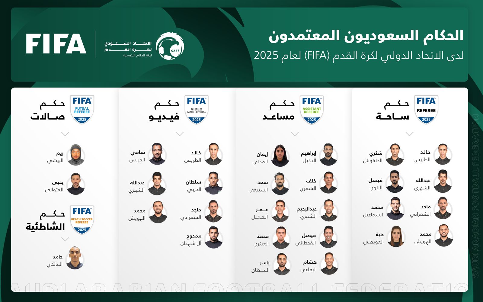 اعتمد الاتحاد الدولي لكرة القدم فيفا قائمة الحكام السعوديين المعتمدين لعام (2025) والتي ضمت (21) حكمًا و(3) حكمات.