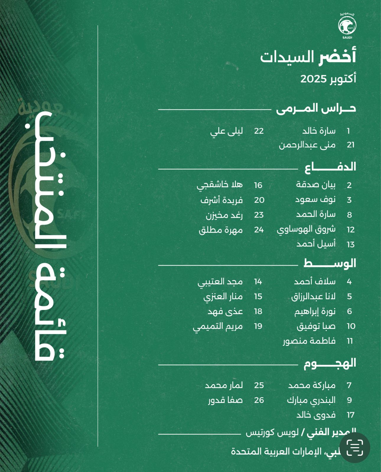 واستدعى المدير الفني لأخضر السيدات السيد لويس كورتيس 26 لاعبة للانضمام إلى قائمة المعسكر: