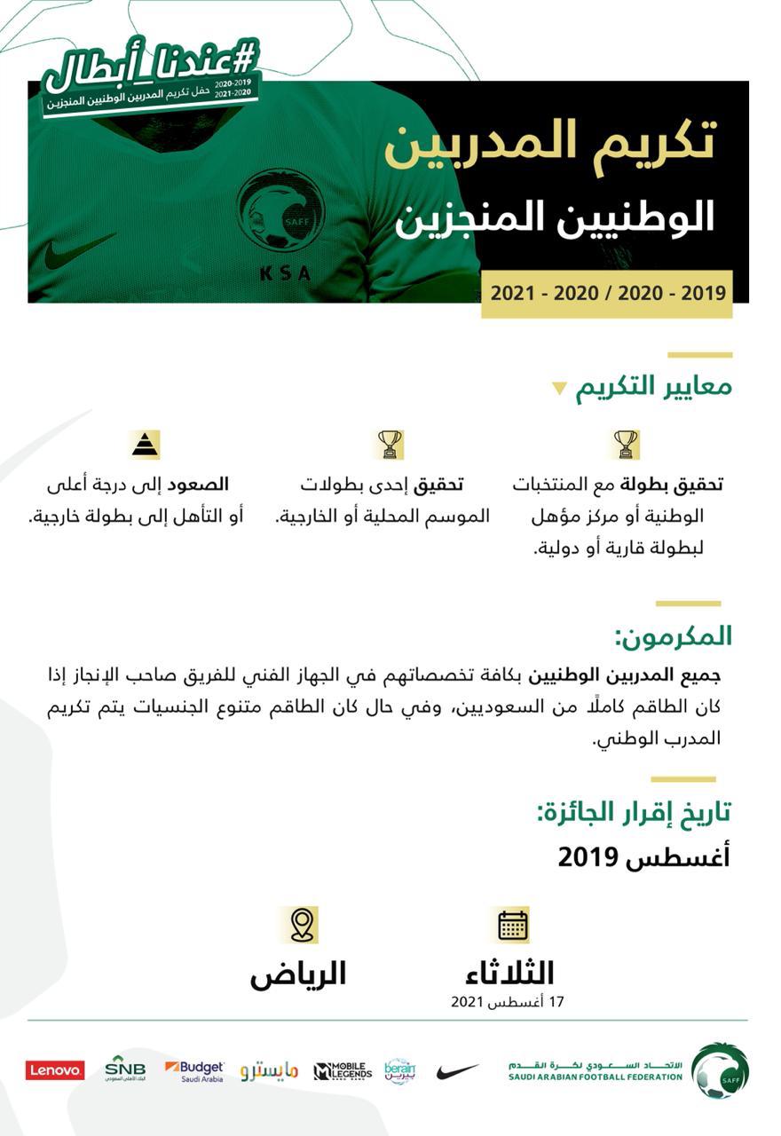 وأوضحت اللجنة في تعميمها الصادر في أغسطس 2019 أن جميع المدربين بكافة تخصصاتهم الفنية مؤهلين للتكريم سواءً كان الجهاز الفني بقيادة غير وطنية أو وطني بالكامل.